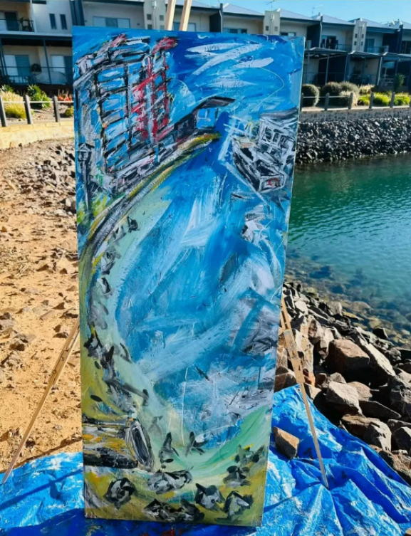 Alocal Aussie who I met in my hometown whilst drinking and sketching at the pub I had sketched both his portrait and him with his dog. Later I was in Melbourne and he  messaged me on social media asking me to paint from a photo referencefor his  girlfriend and her dog which I did a live painting in Burke St Mall in Melbourne duringthe day it was video recorded and then I sent it to him it was a commissioned painting for  his girlfriend’s house warming. It was painting in late 2023.